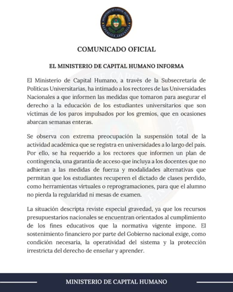 El Ministerio de Capital Humano intimó este martes a los rectores de las universidades nacionales a que informen qué medidas tomarán para garantizar el derecho a la educación de los estudiantes universitarios, a quienes definió como “víctimas de los paros impulsados por los gremios”. Así lo exigió mediante un comunicado oficial difundido en redes sociales.