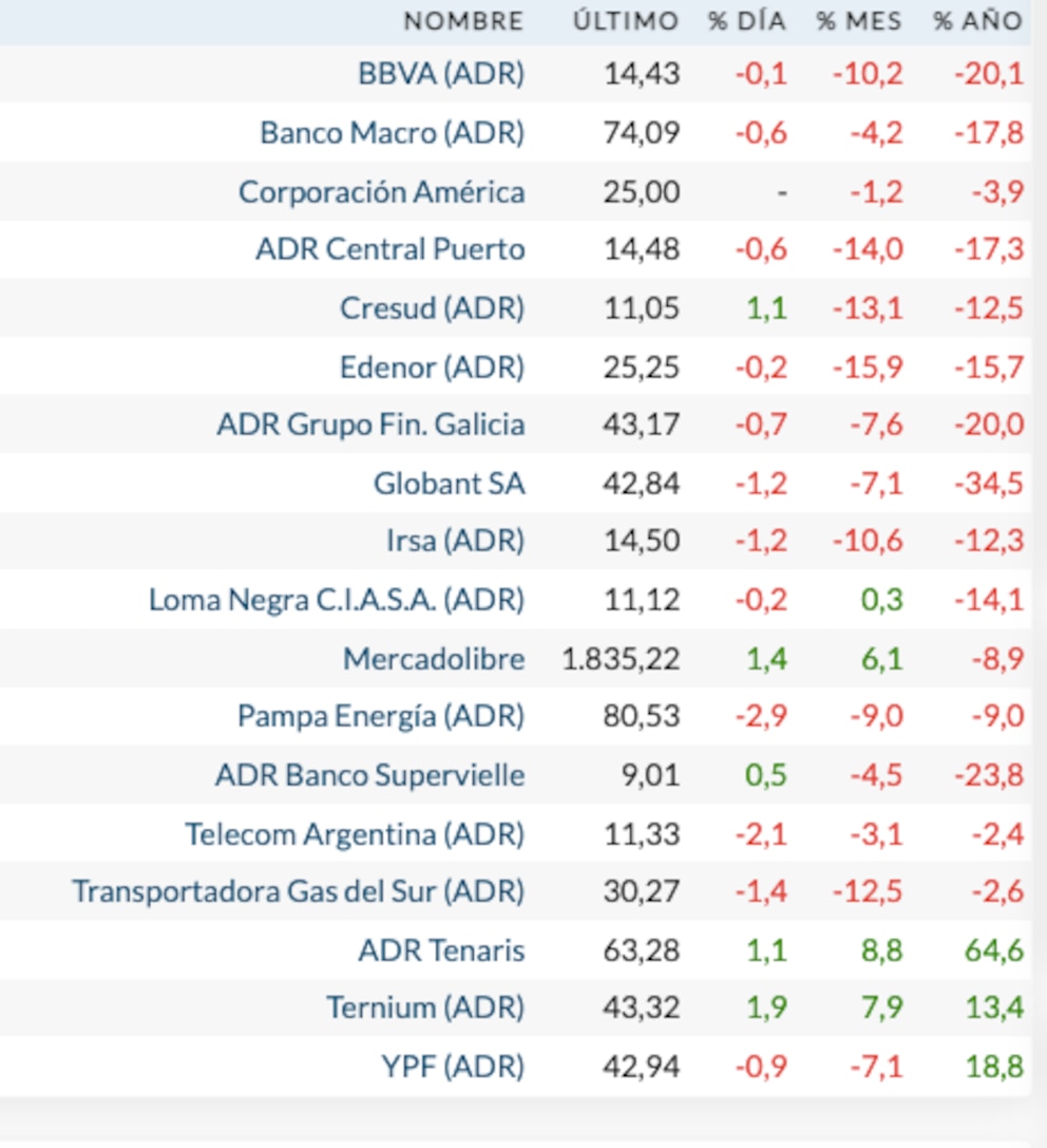 Las compañías ligadas a la energía fueron las que obtuvieron mejores resultados. Vista Energy ganó 7,8% en dólares, el ADR de YPF ganó 5% (a USD 42,94), Tenaris subió 10,5%, aunque Pampa Energía cedió 0,9%, Mercado Libre bajó 1% y Grupo Galicia se hundió 8,1% y Globant se desplomó 13,9 por ciento..